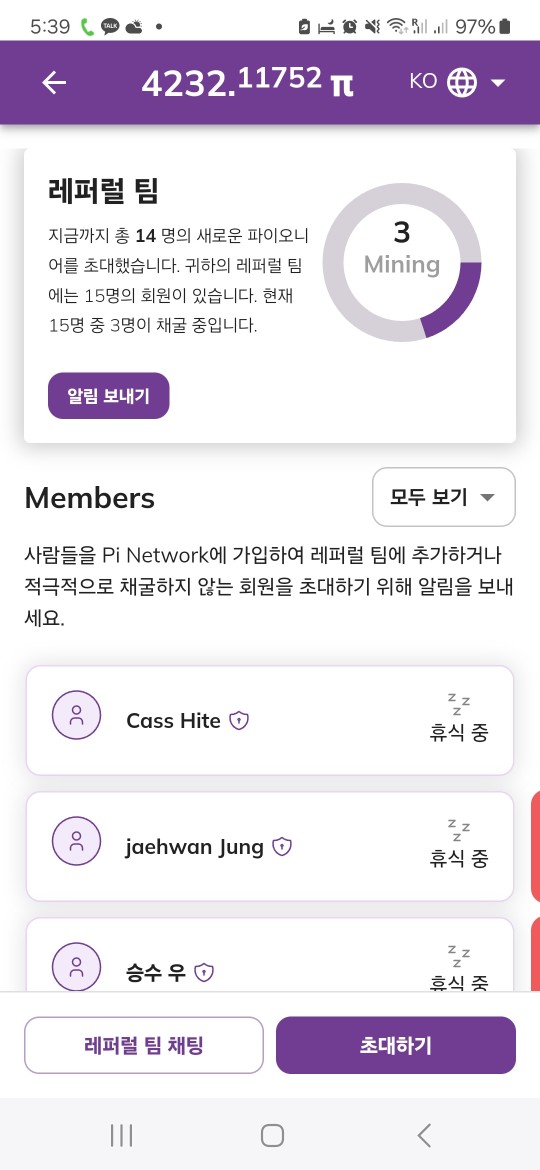 또한 파티원으로 함께 등록하게 되어, 채굴속도 또한 올라가게 됩니다. (일인당 +0.0024 파이/시간)