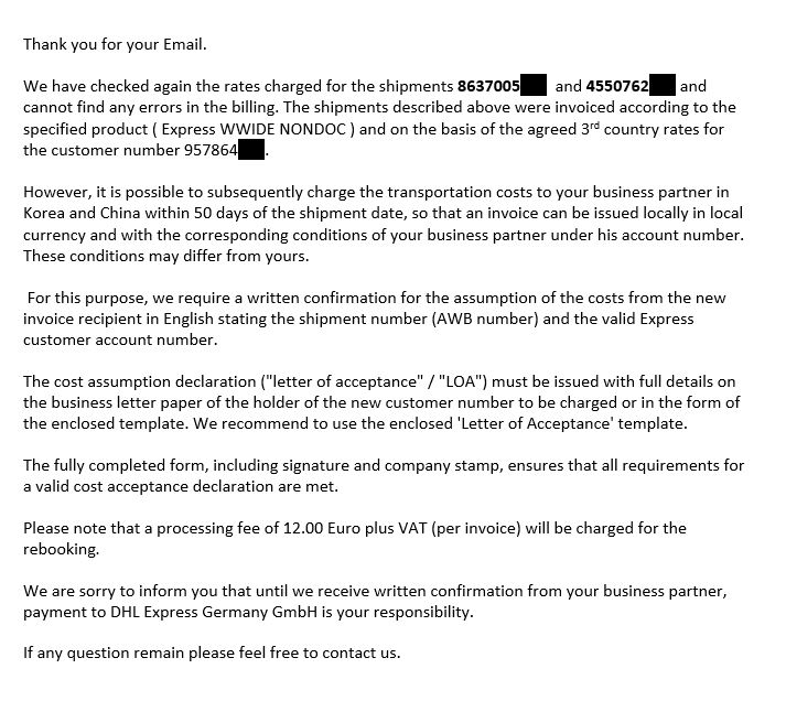 - Use LOA form: Due to frequent overcharging, DHL provides an LOA form. If you request the application of the origin rate in this form, they will recalculate and send it.