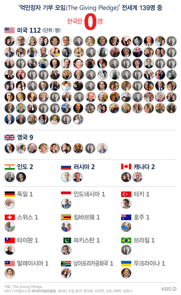 한국에서는 기업인, 그리고 기업 및 단체의 기부가 도드라집니다.