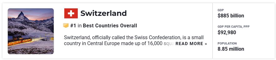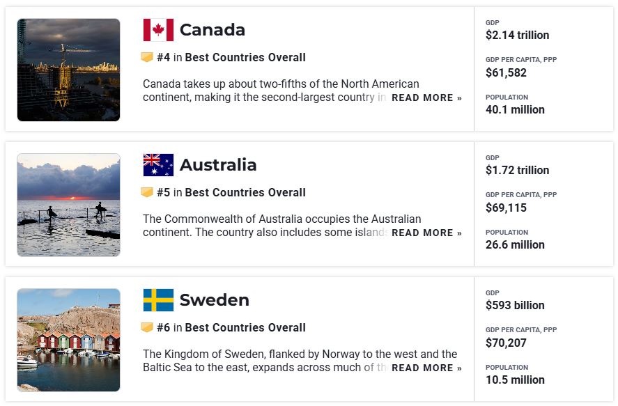 Finally, I’d like to introduce the country with the #1 overall score: It’s Switzerland. Also, Canada, Austria, and Sweden, which are not on the list above, were ranked as top countries to live in, because citizen satisfaction